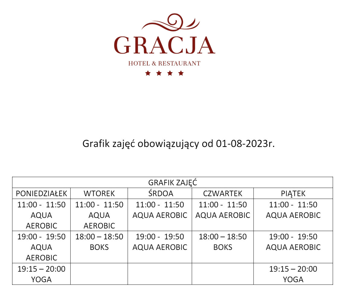 Nasz nowy grafik gwarantuje Wam regularny dostęp do ulubionych aktywności przez cały tydzień. Niezależnie od tego, czy preferujecie treningi w basenie, czy na suchej sali - w Hotelu Gracja znajdziecie coś dla siebie.